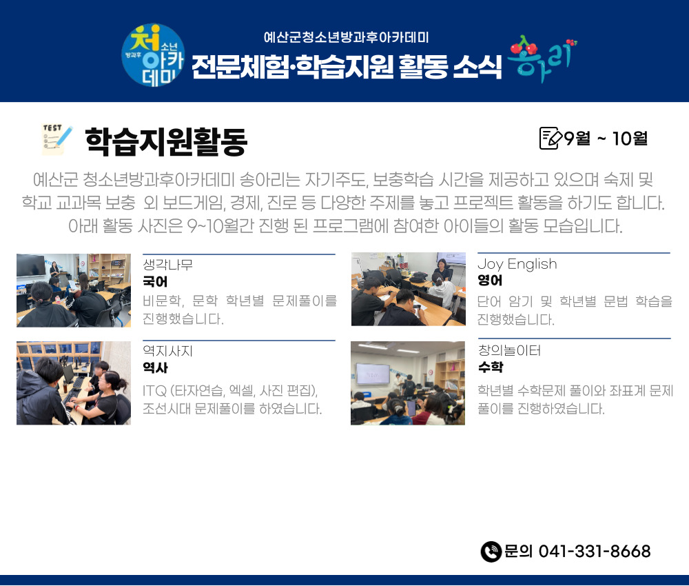 2025년 9월~10월 학습지원활동 사진과 학습내용을 게시하오니 많은 관심과 참여를 부탁드립니다.