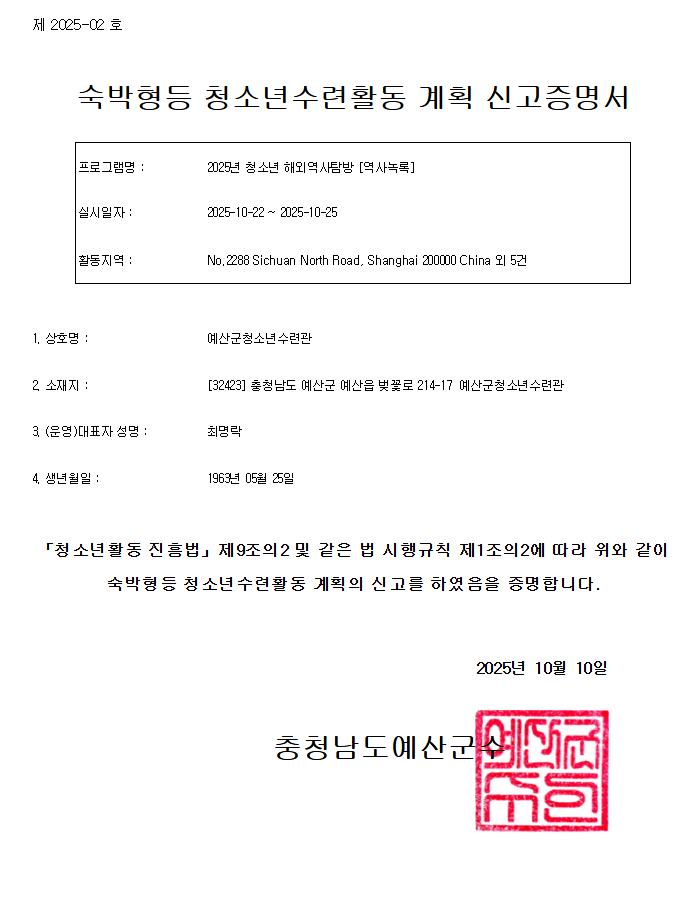 2025년 청소년 해외역사탐방 역사녹록 사전신고 증명서