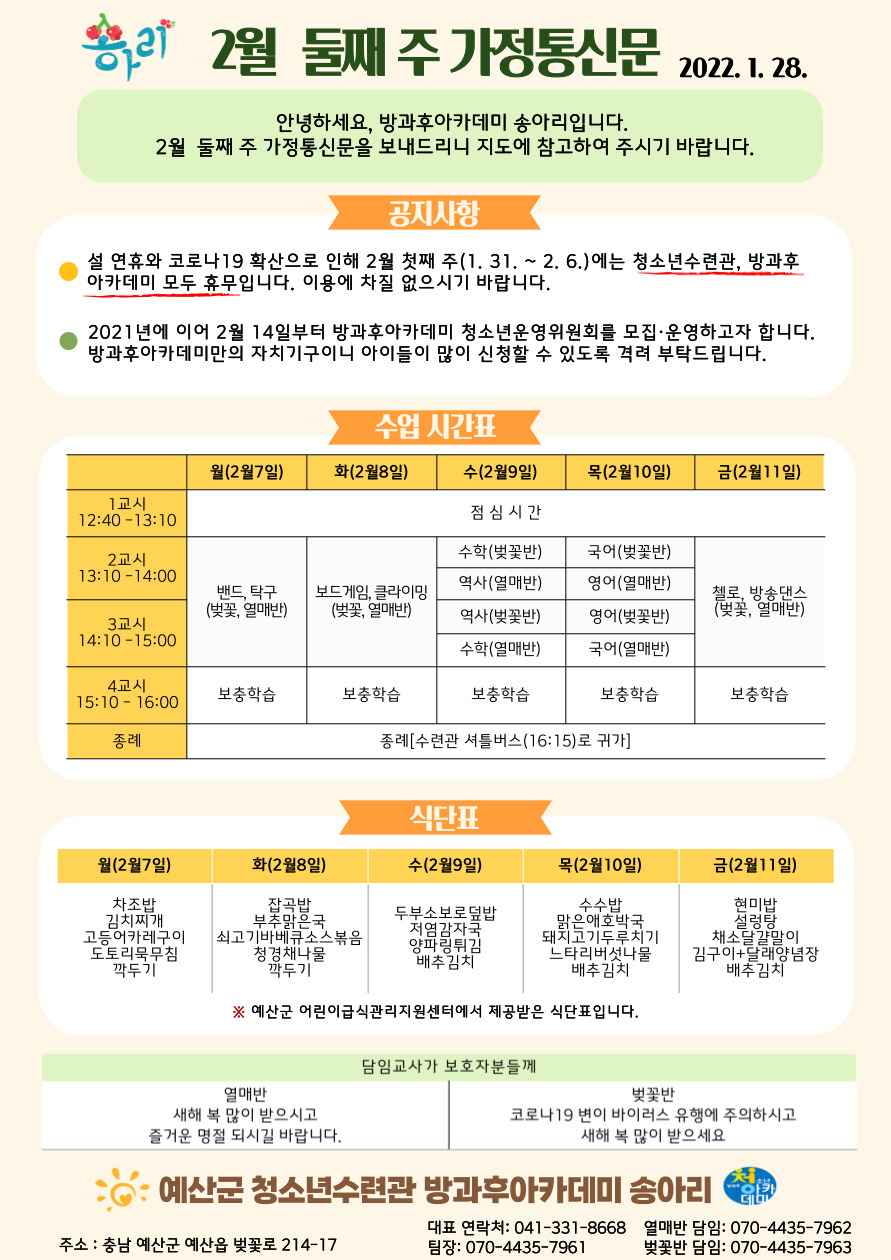 2월 첫째 주에는 설 연휴와 코로나19확산으로 인해 청소년수련관과 방과후아카데미 모두 휴무입니다.